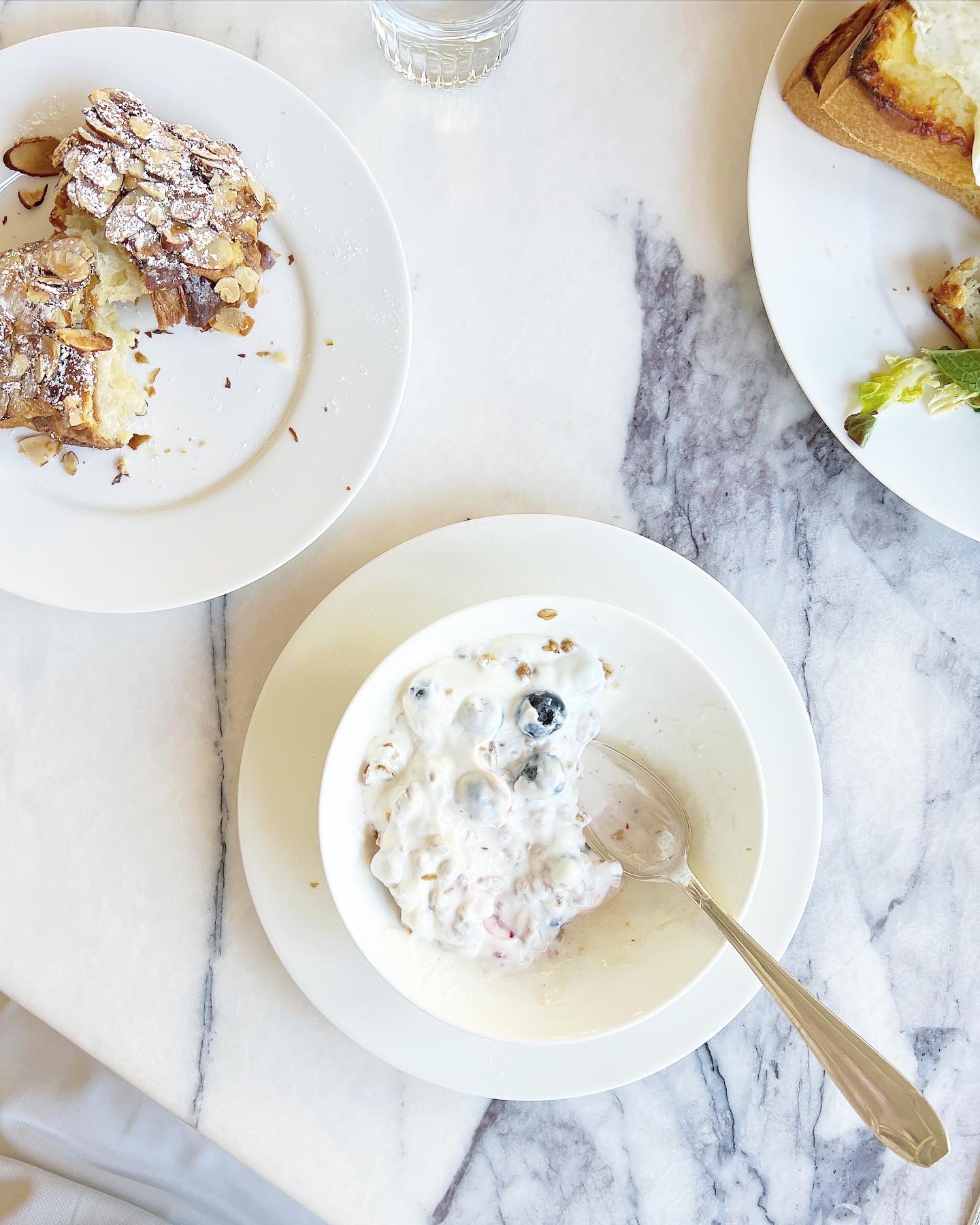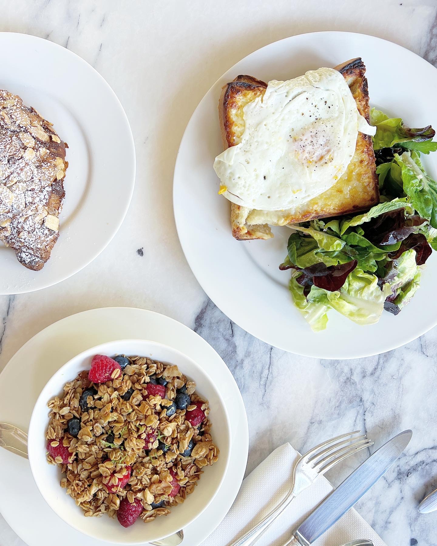 I always prefer to eat light before flying so I zeroed in on the yogurt and granola paired with an almond croissant to satisfy my morning sweet tooth. Looking for something more substantial my husband ordered the perennial classic, croque madame.