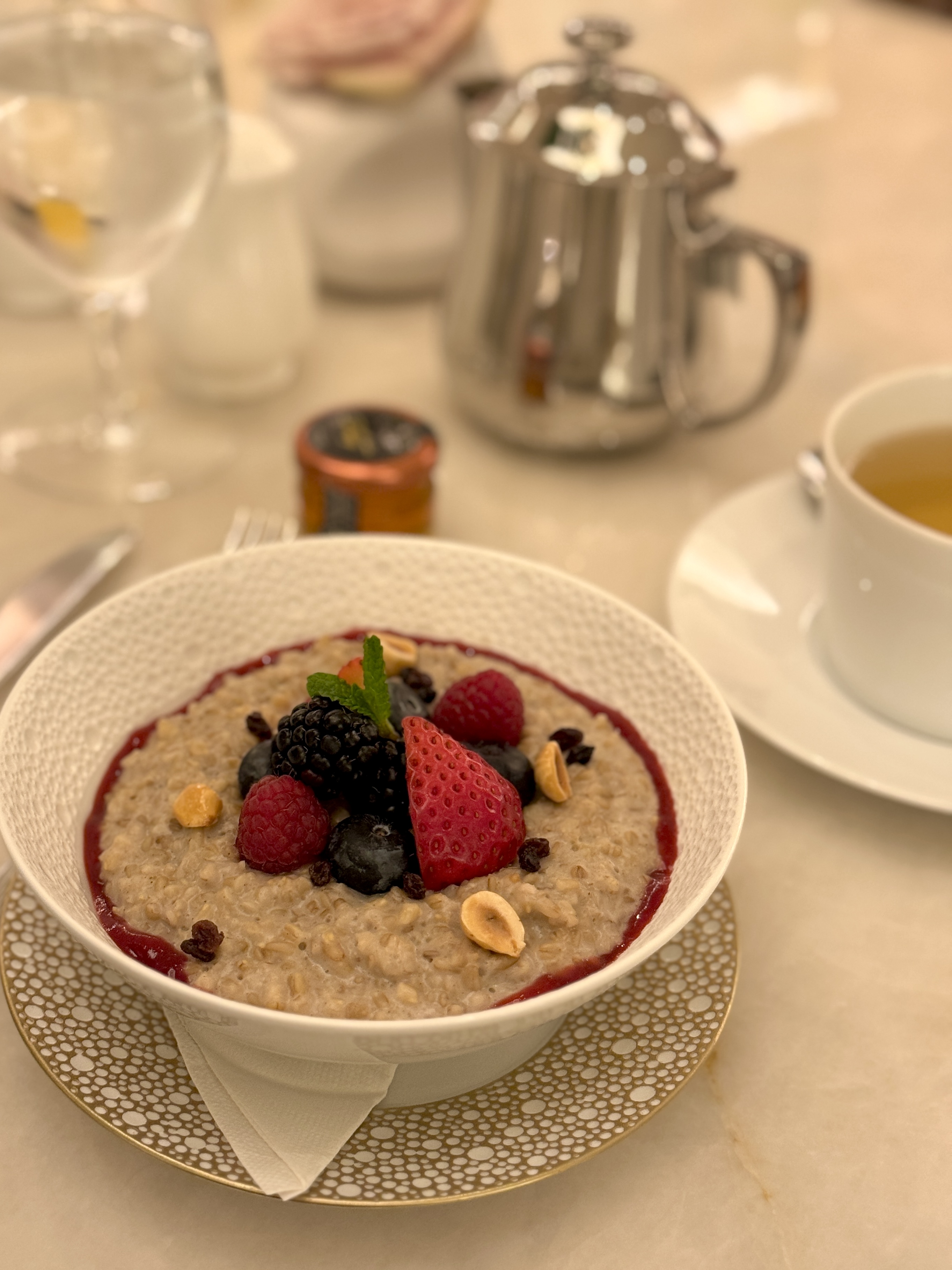 I chose oatmeal loaded with berries and hazelnuts, pain au chocolate, and a green tea. And for the best part? No brunch is complete without dessert.