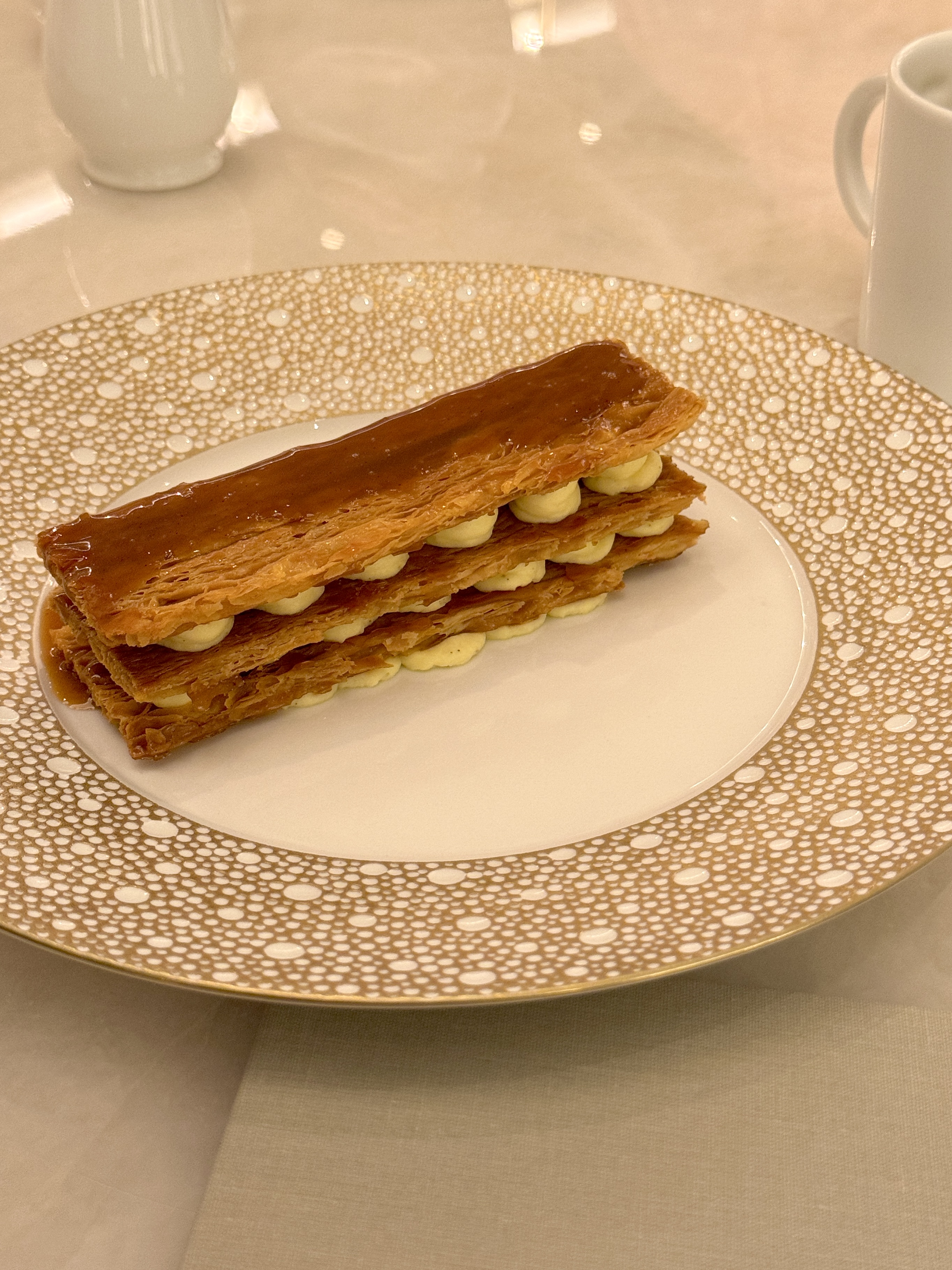 A beautiful mille-feuille appeared and was positively drowned in caramel tableside. Delicious!