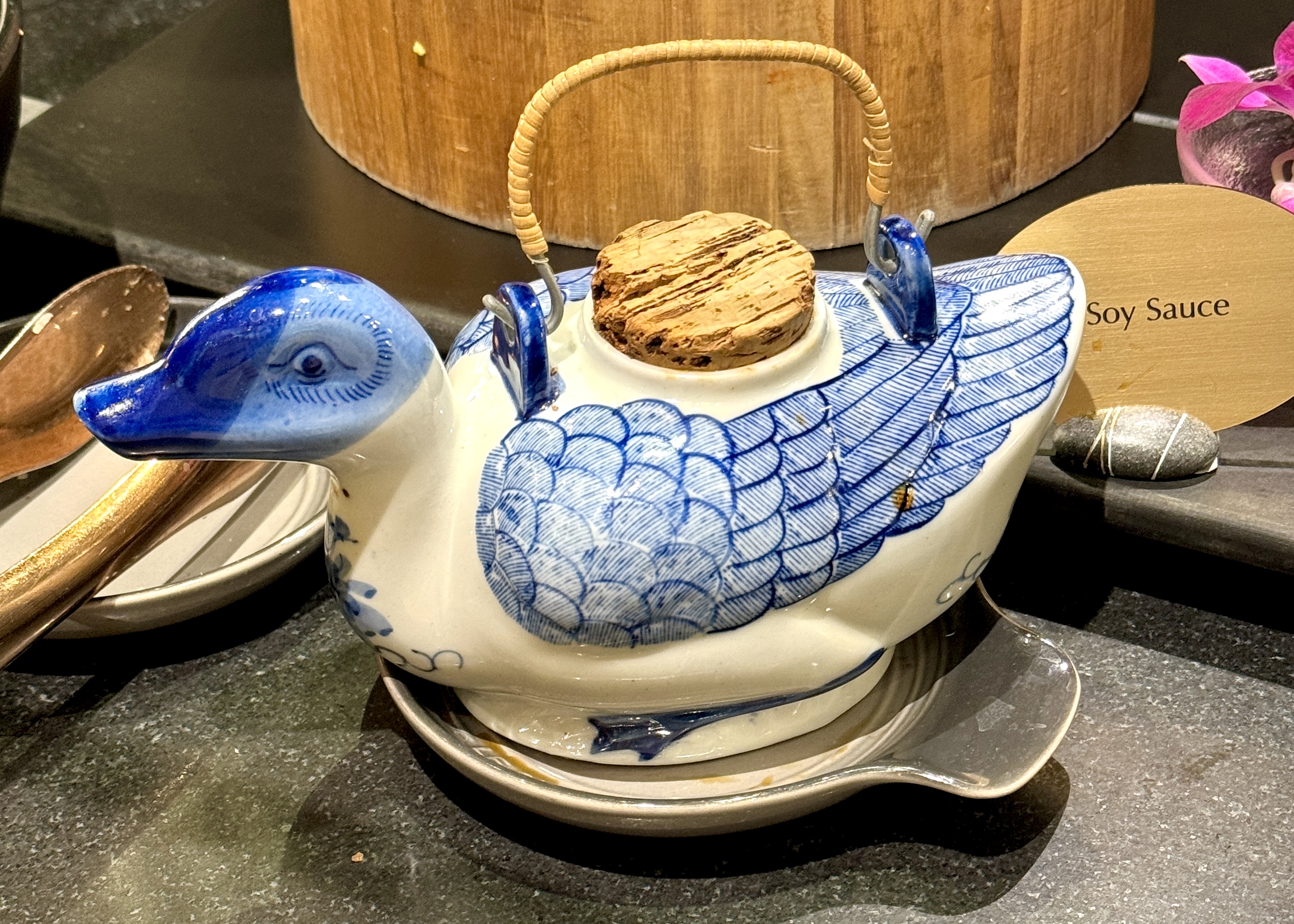Next round was dim sum! This was a bit hit and miss compared to our local choices which have really spoiled us; but the salmon nigiri was a standout. However, the real winner of this round was the soy sauce served in a duck!