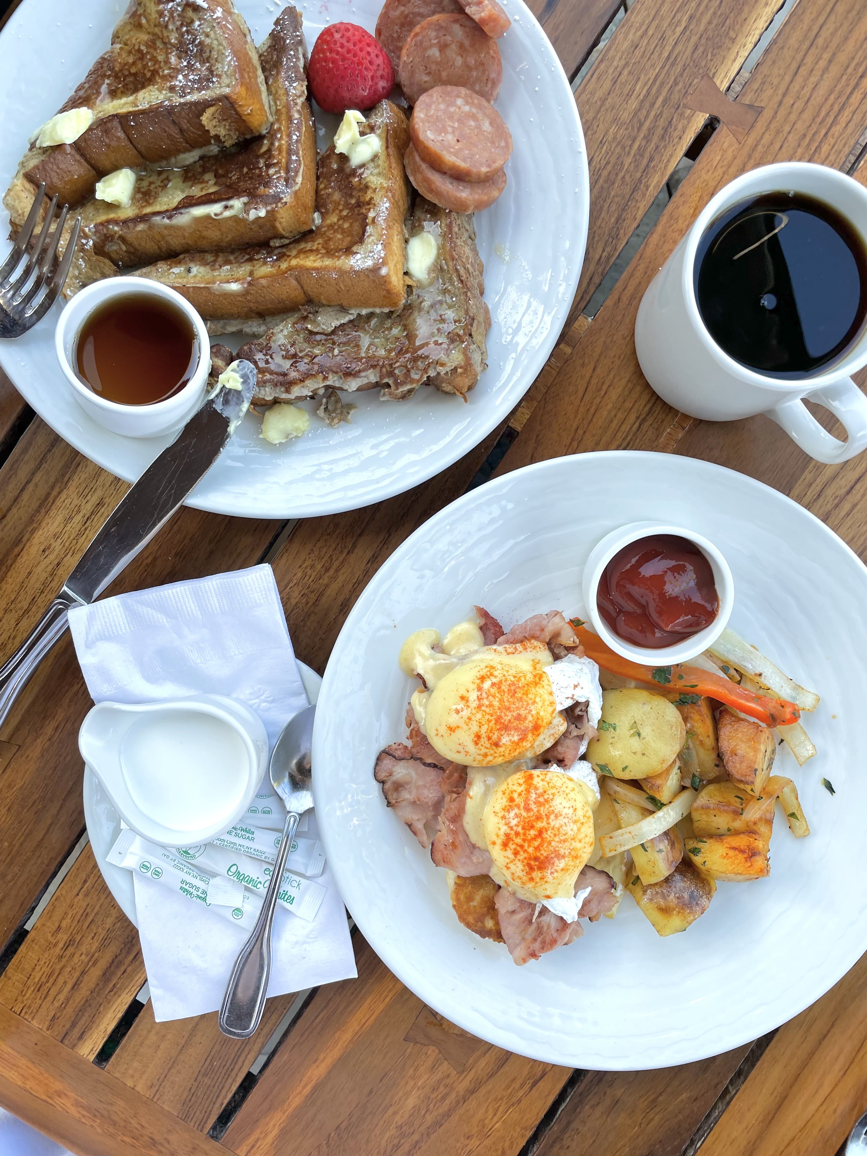 They make a great Duke’s Eggs Benedict served delightfully on a fluffy biscuit. Also, don’t miss the Portuguese Sausage available as a side. Order some for the table!