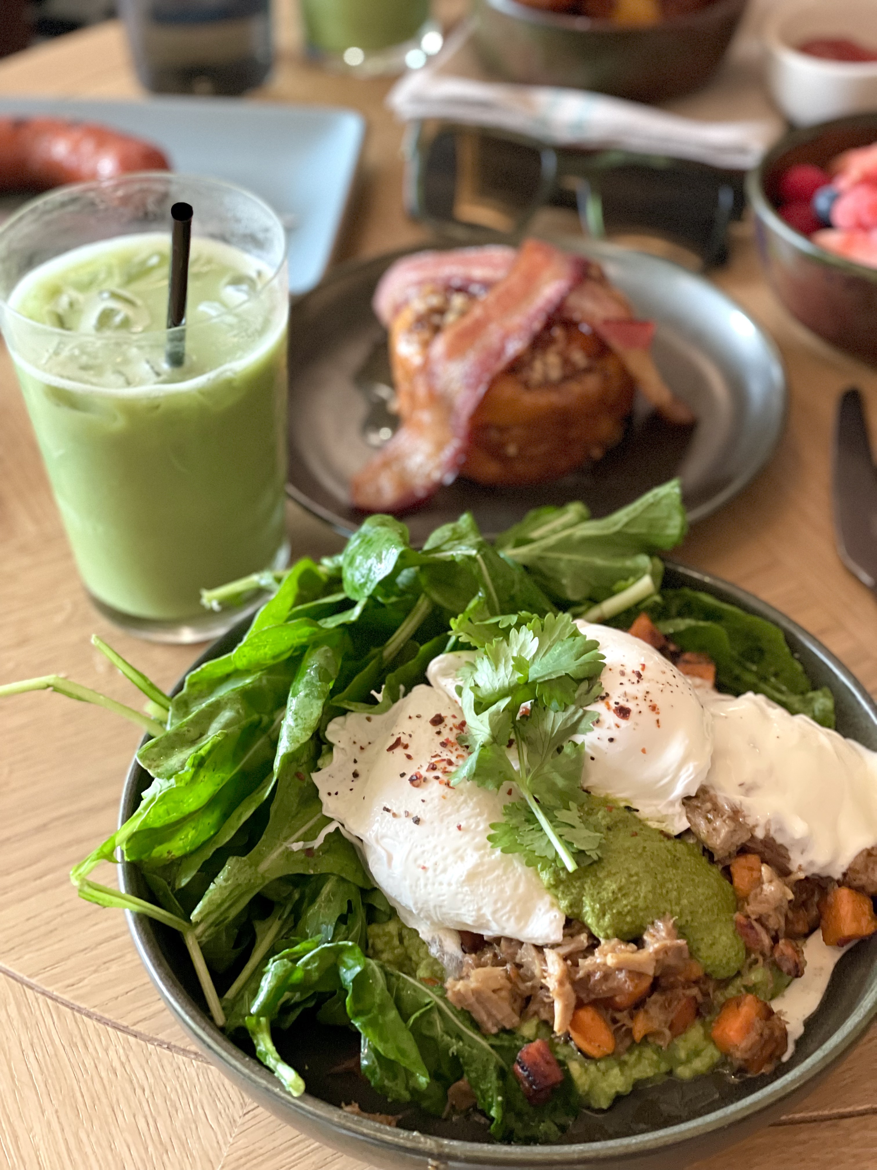 My husband took a page out of my ordering book and cobbled together a breakfast made of sides – crispy Breakfast Potatoes, a beautiful Grilled Linguiça sausage, and Market Berries. In a surprise to both of us, I took a page from his book and ordered the hearty Carnitas Sweet Potato Hash piled high with greens and a poached egg.