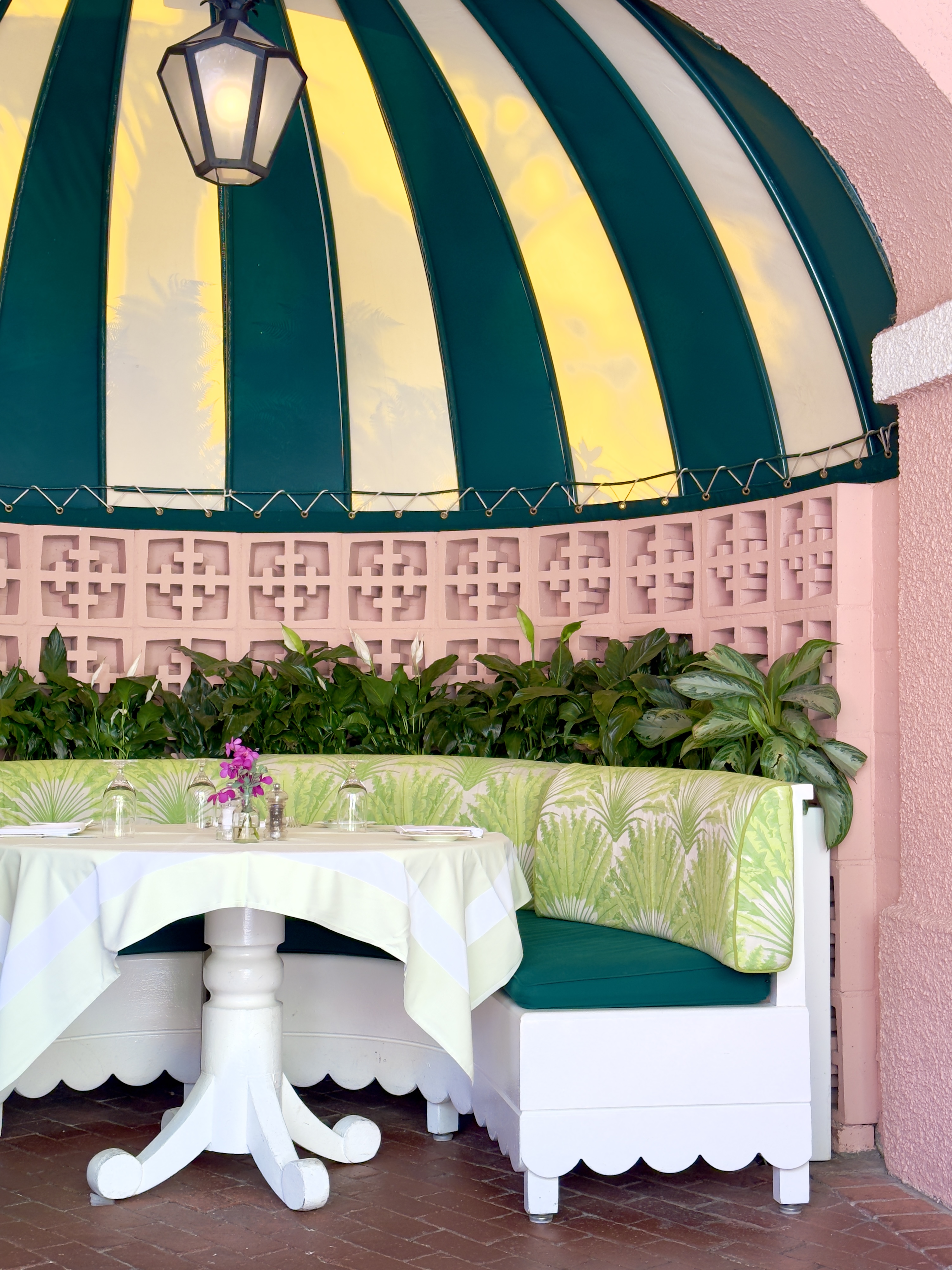 Pink and green hues, tropical upholstery, and domed awnings make it extra special.