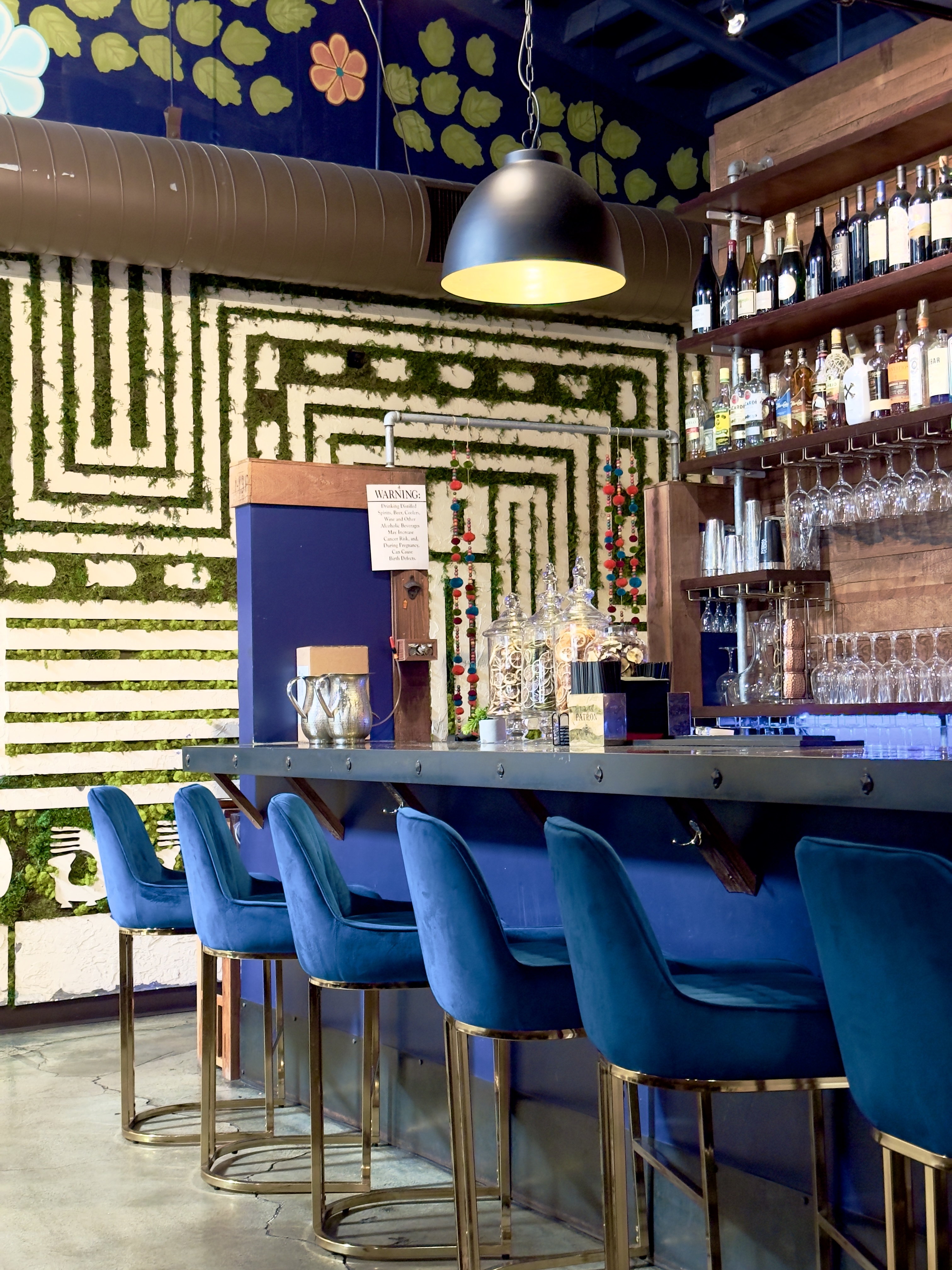 The interior was splashed in color with a topiary maze working its way across the wall. Velvet chairs and plush booths were situated under an expansive, trussed ceiling.